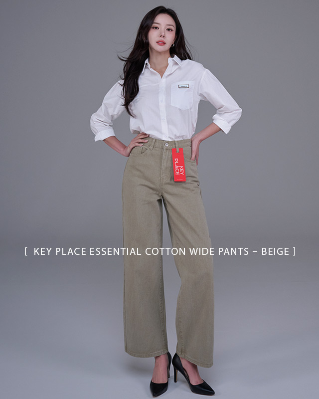 - [ KEY PLACE ESSENTIAL Cotton Wide Pants – Beige ]